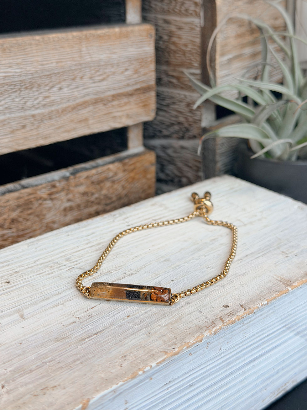 The Golden HOMES Bar Necklace tells the story of all five Great Lakes through layers of real shoreline sand, carefully gathered and preserved in resin.
